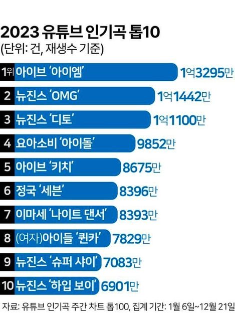 2023年YouTube人氣歌曲TOP10 第1名 IVE - I AM 第2名 NewJeans - OMG 第3名 NewJeans - Ditto 第4名 YOASOBI - Idol 第5名 IVE - Kitsch 第6名 Jungkook - Seven 第7名 imase - Night Dancer 第8名 (G)I-DLE - Queencard 第9名 NewJeans - Super Shy 第10名 NewJeans - Hype Boy 資料來源: YouTube人氣歌曲週榜TOP100 統計時間: 1月6日~12月21日 來源: theqoo https://theqoo.net/square/3051352480 1. 哇,imase 2. I AM真的很好聽 3. I AM和Ditto我到現在還在聽 4. Jungkook的歌是在下半年出的,這樣能上榜也很厲害 5. 我不怎麼聽偶像的歌曲 (不是我喜歡的類型),所以不太清楚,但是我很喜歡I AM 所以我常常會找來看,運動的時候也會播來聽 6. IVE連續兩年第一名耶 7. Jungkook!! 那兩首日文歌也很紅呢 8. 女偶像是怎麼回事... 真的太強了 9. 哇,IVE和NewJeans好厲害 10. I AM是今年出的歌曲當中我最喜歡的 11. 哇,TOP10竟然有兩首日語歌... 但是這兩首在年輕人當中確實很受歡迎 12. 有Jungkook的Seven耶 13. 我很常用YouTube Music聽I AM 14. 出現在女團全盛期的Jungkook 15. Jungkook的Seven下半年才出,居然進了TOP10,真的好驚人 轉自:韓網評論翻譯站 https://i.imgur.com/659rbvB.jpg