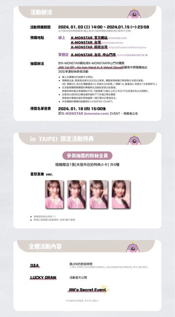 JINI An Iron Hand In A Velvet Glove專輯發行紀念粉絲見面會 in TAIPEI 活動日期:24.01.27(六) 16:00~ 活動預購期間: 24.01.03(三) 14:00~24.01.15(一) 23:59 得獎發表日期: 24.01.18(四) 15:00後個別通知得獎者 面對面簽名會 30名 https://i.imgur.com/q2uCAAW.jpg
