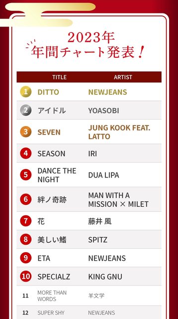 據經紀公司ador透露, “Ditto” 登上了日本FM廣播"J-WAVE"發表的2023年年度排行榜"TO