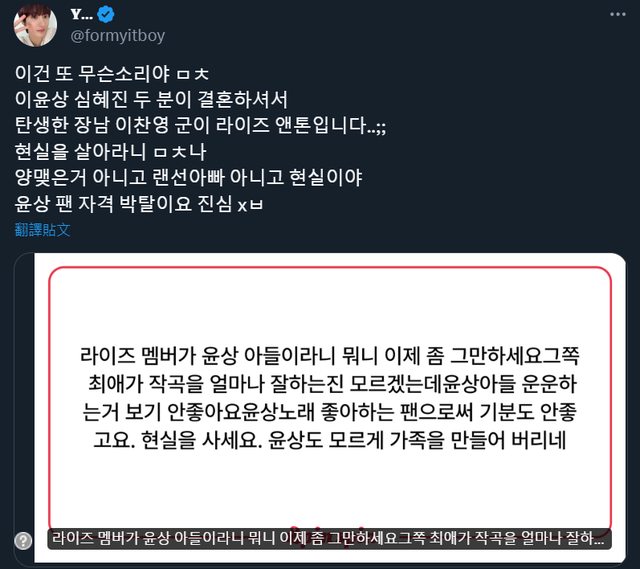 該名網友表示:「RIIZE的成員是尹尚的兒子?拜託不要再傳謠了,不知道你們喜歡的偶