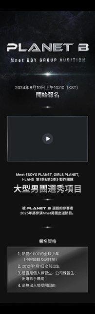 MNET 新男團選秀節目 《PLANET B》 官網:https://mnetplanetb.net 節目預計2025播出 2024/8/10 10:00開始報名 https://youtu.be/6TFYhR3yCKk?si=jgRPvEMmhKRT3Tl1