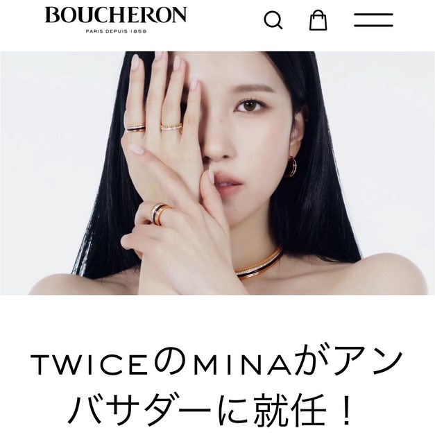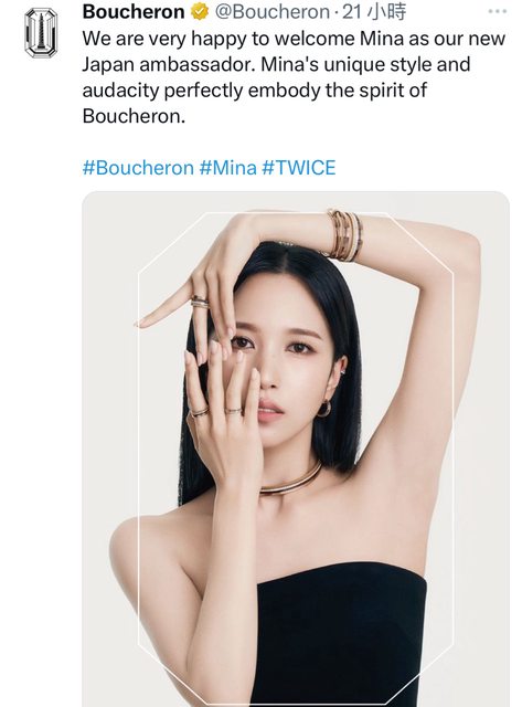 BOUCHERON 8月28日宣佈,將選任TWICE成員MINA擔任日本大使,並公開穿戴品牌珠寶的形 象影片 10幾歲時來到韓國,與自願開闢新境界之路的MINA成為夥伴,共享品牌藍圖和價值觀,書 寫新的篇章。MINA今後將透過各樣活動和媒體內容登場。 https://i.imgur.com/OyXW1Me.jpeg