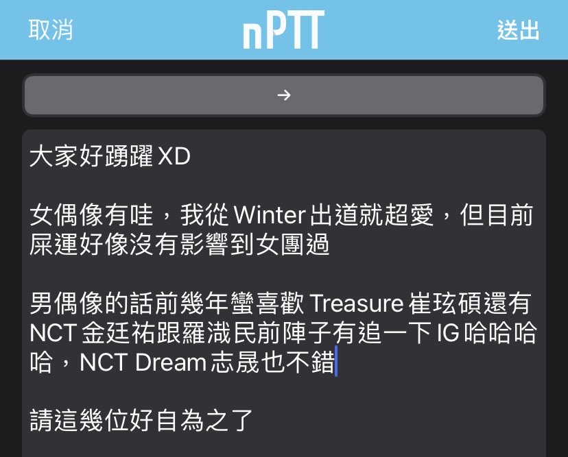 昨天看到文泰一的新聞真心傻眼,求問大家追星擊落率過高該怎麼處理啦我真的是無奈至極 欸 也歡迎大家來找我避雷哈哈哈 (苦笑) 1. 權志龍 (G-Dragon):當初龍哥呼麻的新聞也算是前無古人的轟動畢竟那麼大咖; 但跟底下那幾位比犯行大概是小巫見大巫 2. 金韓彬 (B.I):跟龍哥一樣,尤其那時候還在李遐怡合作曲宣傳期; 也因為這件事情從每天都關注iKON的Mix & Match鐵粉到現在都不看了,氣死 3. 鄭俊英:上不朽的名曲還有Sugarman的翻唱都超好聽,可能這種厚嗓滄桑系剛好很對 我的胃; 但性犯罪滾 4. 閔玧其:這個應該是我最用力喜歡最久的,吝嗇如我還為了他買兩張專輯+每天loop A gust d 的mixtape; 雖然已經退坑超久了但還是算真心放水流,酒駕的人給我下去 5. 文泰一:這個我真的是嚇壞== 他在NCT裡面就是主打一個老實大哥哥人設,團綜也看 得出來弟弟們很信任也很依賴他; 對我來說就是NCT裡面唱功音色最突出、演唱會上也相當不可或缺的主唱,雖然道英也很 會唱但總覺得少了泰一的力量感 也因為這樣泰一團內團外的Solo基本上都會特別找來聽甚至存在歌單裡,希望他的好聲音 有機會能被聽見 以前想說也許自己追的是Rapper居多所以比較容易出事吧,結果連文泰一這種透明到不行 的人還是難逃我的魔掌… 請問本人還要繼續追星嗎哈哈哈哈嗚嗚嗚嗚 *更* 謝謝大家的踴躍,本人備感欣慰XD 目前有確定在追的有aespa Winter,之前蠻喜歡的有NCT廷祐渽民跟志晟、還有Treasure 玹? 至於虛擬偶像我看還是不要好了,艾斯五條跟鼬都死了然後兵長半殘,你們確定要推我Pl ave嗎哈哈哈哈 *再更* 下班才發現忘記提到RIIZE成燦跟恩奭,他們是我現在唯一有追蹤IG的男團 ※ 發信站: 批踢踢實業坊(www.ptt.org.tw), 來自: 223.137.157.33 (臺灣) ※ 文章網址: https://www.ptt.org.tw/KoreaStar/M.1724913567.A.872