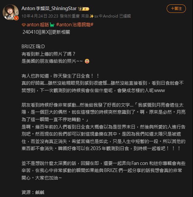 → fizben: 日全食是在9/2 所以在9/2發布 114.40.24.145 09/03 11:07
