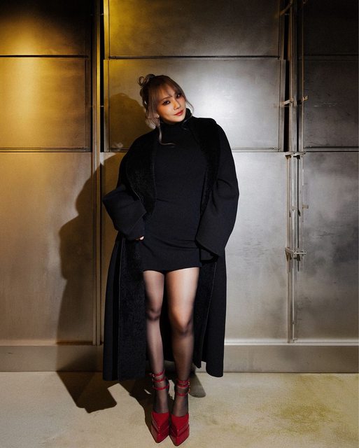 在公開的照片中,CL身穿全黑衣服,腳上穿了鮮紅色高跟鞋。身著短裙展現腿部曲線美的