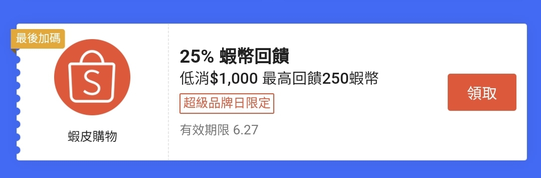 → coldplay0620: 剛剛搭洗髮精用滿1000回饋250蝦幣很 220.133.91.132 06/27 22:54