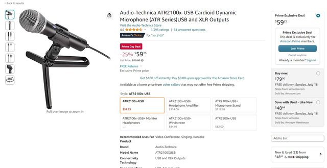 如圖ATR-2100x麥克風有amazon prime會員的話是60美元,沒會員不會顯示這個優惠