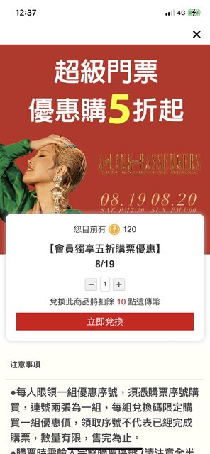 活動訊息: https://reurl.cc/4oGZ8K 活動內容: 主要就是現在遠傳心生活增加了不少演唱會和全台各大遊樂園的優惠票可以換購... 一般會員可以用20幣換購7折門票 VIP會員可以用10幣換購5折門票 算起來真的超優惠!特別是很多演唱會市面上都完售了,這裡應該是最後搶票機會... 現在有開放的是A-lin的高雄巨蛋的演唱會 https://i.imgur.com/3ZR7OBt.jpg