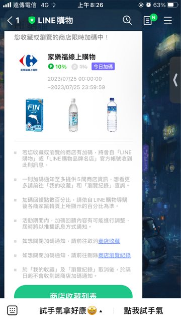推 kkkk1234: 家速配生鮮滿399有LINE購物10%+紅利 114.37.155.232 07/25 11:45
