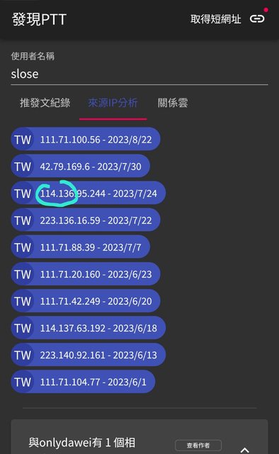 噓 tsaigi: 同個網段的ip 也可以一個台北 一個高雄223.141.27.117 08/23 08:59