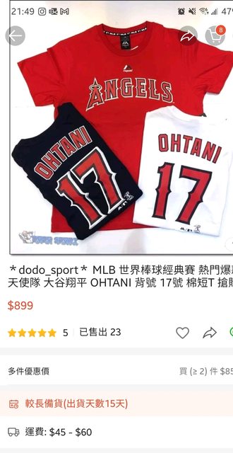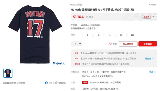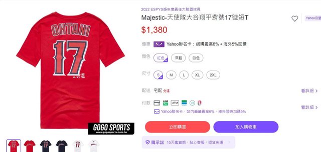 大谷翔平 OHTANI 17號 棉質短T 目前樂天特價$899,搭配超商免運 購物車選擇50元折價券可以到$849 購買連結:https://www.rakuten.com.tw/shop/toxin/product/1082024115/ 在購物車才可以選擇用50折價券 https://i.imgur.com/rJc7p8R.jpg