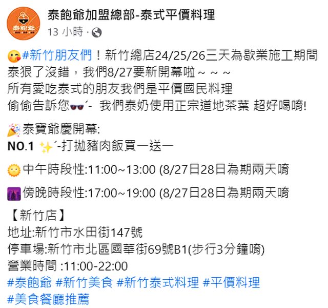 地點 : 新竹市水田街147號 時間 : 8/27~8/28,每日11~13點、17~19點 優惠 : 打拋豬肉飯買一送一 理由 : 新開幕 https://i.imgur.com/RZNhkVs.png