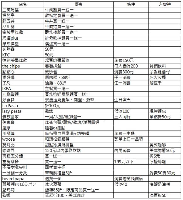 同為8月壽星,自己也整理了一些優惠, 都只是一些小優惠而已,但生日月能換到這些小確幸還是覺得滿足,有些店家還能跟入會禮 同時使用, 蠻多是透過Ocard加會員,如果已經有加過其他店的會員,app能通用,不用一直重複填資料 , 提供給大家參考~~~ https://i.imgur.com/fpnI7QA.jpg