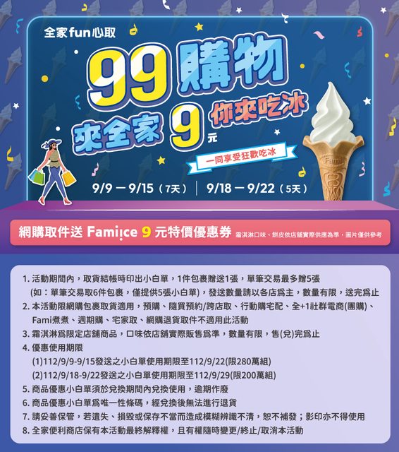 全家9月又有活動 一樣是全家取件送9元優惠券 而且聽說新口味好像是荔枝烏龍還是荔枝美人茶 又是古娃娃聯名 有點期待~ 活動內容:全家取件送9元霜淇淋 時間:9/9-9/15、9/18-9/22,12天 https://i.imgur.com/ZJ3erjc.jpg