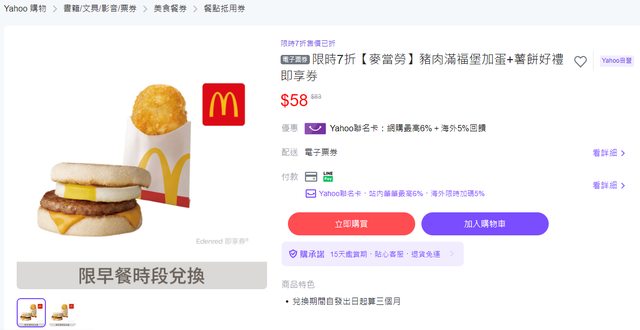 標題[情報] 麥當勞:豬肉滿福堡加蛋+薯餅即享券 $58
