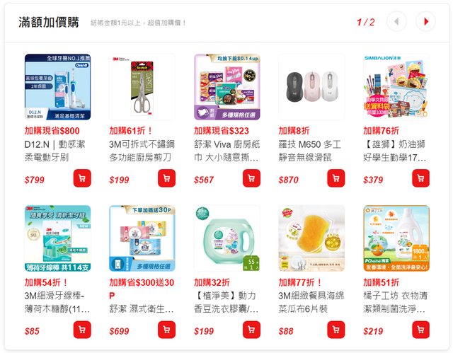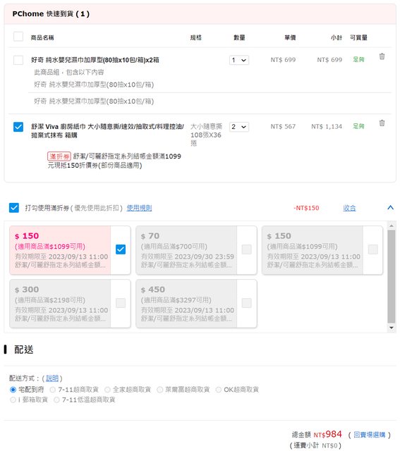 不知道是不是BUG,不用買其他東西就可用加購價+折價券 原本在PChome看濕紙巾,發現舒潔廚房紙巾加購一箱36捲$567,1099折150 所以,買兩箱=984,984/2/36=一捲13.6 https://i.imgur.com/dLYbJbF.jpg