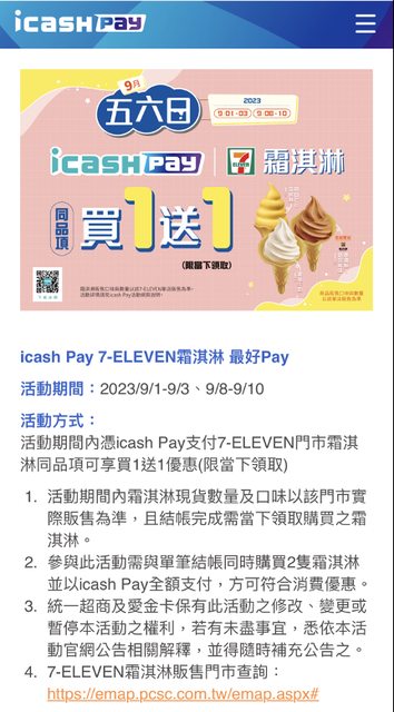 霜淇淋icashpay五六日買一送一又來了 活動期間:2023/9/8-9/10 活動方式:活動期間內憑icash Pay支付7-ELEVEN門市霜淇淋同品項可享買1送1優惠(限當 下領取) 可以先查一下門市 https://i.imgur.com/K1z0fry.jpg