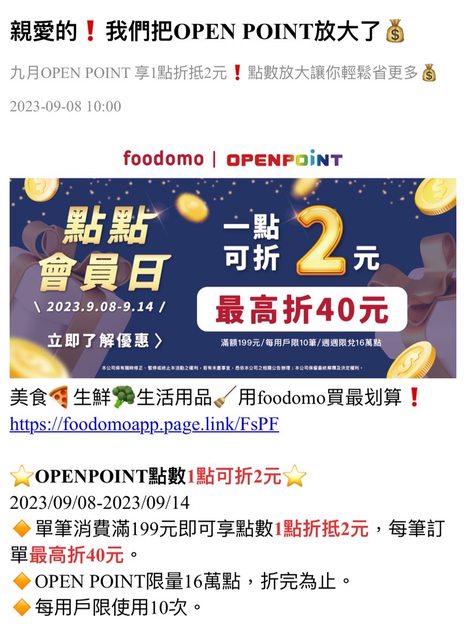 如圖 早上收到foodomo推播 OPENPOINT一點折2元的活動又有了 這家好像蠻常會有OPENPOINT的活動? 如果你是新客可以搭配輸入『新手好幸運』 可以再多折100塊 ---- Sent from BePTT on my iPhone 13 Pro Max -- ※ 發信站: 批踢踢實業坊(www.ptt.org.tw), 來自: 61.216.59.164 (臺灣) ※ 文章網址: https://www.ptt.org.tw/Lifeismoney/M.1694158084.A.AF1