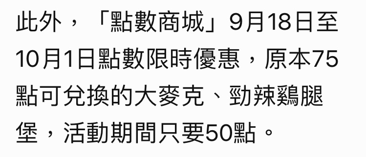 如題 剛在隔壁版看到的 https://www.mcdonalds.com/tw/zh-tw/newsroom/2023/20230906 麥當勞慶祝LINE點數商城上線 9/18-10/1 點數降價優惠 麥香堡/勁辣雞腿堡:50點 原/辣味麥脆雞:5點+20元 省錢點: 麥脆雞5點+20元 就能兌換 等於只要25元 應該是史上最低價了 -- ※ 發信站: 批踢踢實業坊(www.ptt.org.tw), 來自: 112.78.77.15 (臺灣) ※ 文章網址: https://www.ptt.org.tw/Lifeismoney/M.1694162358.A.49B