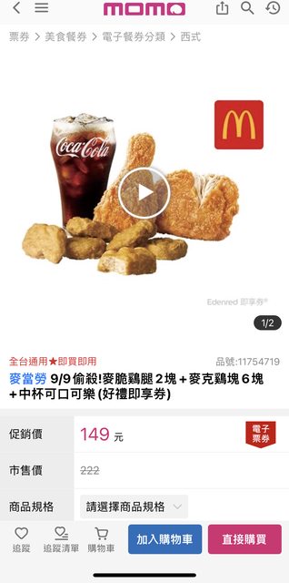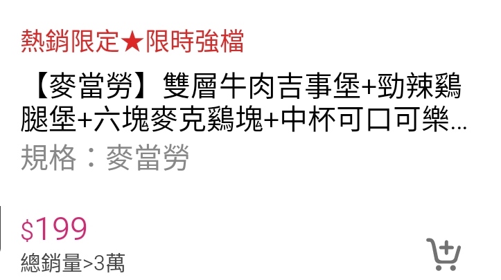linx210145: 爛,蝦皮麥脆48元,麥克雞塊原本就1+1, 27.52.130.112 09/09 00:45