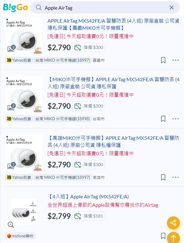 雅虎奇摩周年慶活動商品 Apple AirTag 4入賣$2790 https://reurl.cc/V4Xar6 今天還有萊爾富免運可以用 https://reurl.cc/GKrk93 有需要的可參考 -- ※ 發信站: 批踢踢實業坊(www.ptt.org.tw), 來自: 101.12.22.242 (臺灣) ※ 文章網址: https://www.ptt.org.tw/Lifeismoney/M.1694397640.A.526
