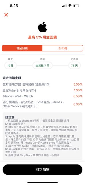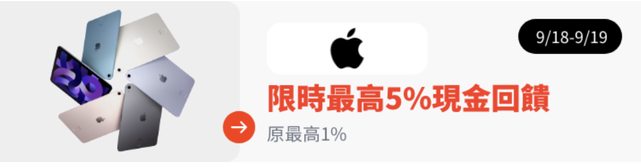9/18 - 9/19 透過SHOPBACK導購蘋果官網, 教育優惠方案限時加碼回饋5%, 比Line購物前幾波高一點點。 注意它有特別列出”教育優惠”, 所以應該要購買有Pencil、耳機折扣的商品才會認列。 ---- Sent from BePTT on my iPhone 13 -- ※ 發信站: 批踢踢實業坊(www.ptt.org.tw), 來自: 36.236.106.73 (臺灣) ※ 文章網址: https://www.ptt.org.tw/Lifeismoney/M.1694997453.A.582