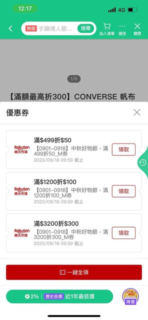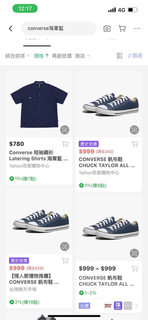 路徑: Line 購物 搜尋 converse海軍藍 → 價格排序“最低價” → 導引到樂天市場 → 領取優惠券 折50 → 結帳 省錢點: LINE購物2%+樂天點數5%+折50 算下來一雙$882,接近專櫃的5 折價了 推薦原因: 基本款基本上就百搭,個人推薦配牛仔寬褲 連我這個宅宅都可以微 潮 https://i.imgur.com/XCPcENt.jpg