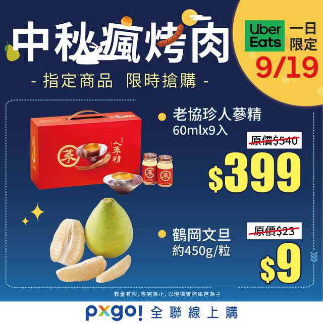 中秋瘋烤肉!全聯小時達! 單日限定!只有今天! 9/19一日限定最殺價,最低39折 鶴岡文旦 $9 老協珍人蔘精 $399 *活動詳情與售價請洽app或官網,以公告為準 *實際活動內容及服務範圍依App顯示為主 *優惠數量有限,售完為止 -- ※ 發信站: 批踢踢實業坊(www.ptt.org.tw), 來自: 220.130.178.240 (臺灣) ※ 文章網址: https://www.ptt.org.tw/Lifeismoney/M.1695108287.A.323