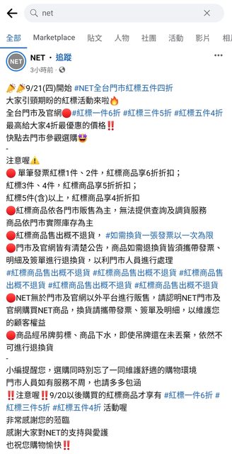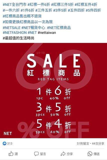 9/21(四)開始 #NET全台門市紅標五件四折 大家引頸期盼的紅標活動來啦 全台門市及官網 #紅標一件6折 #紅標三件5折 #紅標五件4折 最高給大家4折最優惠的價格‼ 快點去門市參觀選購 - 注意喔 單筆發票紅標1件、2件,紅標商品享6折折扣; 紅標3件、4件,紅標商品享5折折扣; 紅標5件(含)以上,紅標商品享4折折扣 紅標商品依各門市販售為主,無法提供查詢及調貨服務 商品依門市實際庫存為主 紅標商品售出概不退貨, #如需換貨一張發票以一次為限 門市及官網皆有清楚公告,商品如需退換貨皆須攜帶發票、明細及簽單進行退換貨,以 利門市人員進行處理 #紅標商品售出概不退貨 #紅標商品售出概不退貨 #紅標商品售出概不退貨 #紅標商品售出 概不退貨 #紅標商品售出概不退貨 NET無於門市及官網以外平台進行販售,請認明NET門市及官網購買NET商品,換貨請攜 帶發票、簽單及明細,以維護您的顧客權益 商品經吊牌剪標、商品下水,即使吊牌還在未丟棄,依然不可進行退換貨 - 小編提醒您,選購同時別忘了一同維護舒適的購物環境 門市人員如有服務不周,也請多多包涵 ‼ 注意喔‼ 9/20以後購買的紅標商品才享有 #紅標一件6折 #紅標三件5折 #紅標五件4 折 活動喔 非常感謝您的蒞臨 感謝大家對NET的支持與愛護 也祝您購物愉快‼ - #NET全台門市 #紅標一件6折 #紅標三件5折 #紅標五件4折 #一件六折 #1件6折 #三件五折 #3件5折 #五件四折 #5件四折 #紅標商品售出概不退貨 #如需更換紅標商品以一次為限 #NETSALE #NET暢貨中心 #NET紅標商品 #NETFASHION #NET #nettaiwan #最超值的生活時尚 https://i.imgur.com/2xvkmN3.jpg