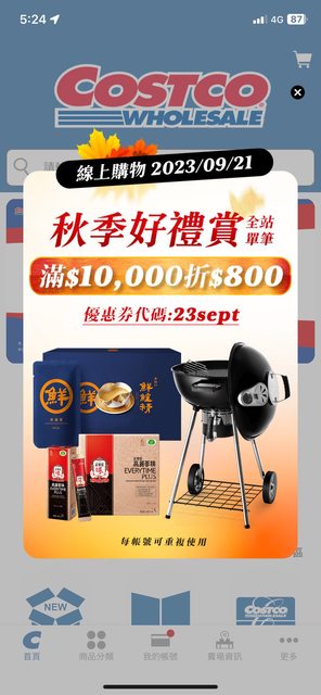 好市多線上 1萬折800 限9/21 折扣碼: 23sept https://i.imgur.com/wuOJwdT.jpg