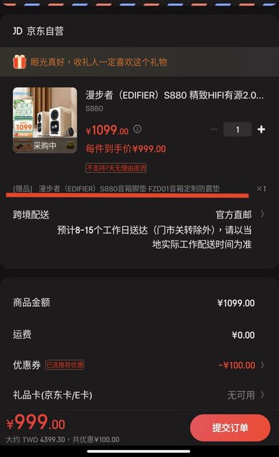 漫步者音箱系列,免運持續熱賣中! 漫步者(EDIFIER)R1700BT+,降價人民幣60元了(上週購買的記得按價保) https://u.jd.com/S8ChvqY 漫步者(EDIFIER)S880 https://u.jd.com/SzC7zrY 漫步者(EDIFIER)MR4 https://u.jd.com/S8CmDDT -- 京東購物須知: 1.新註冊帳號,轉盤什麼的千萬別點,創好就直接領新人券並消費最穩。 2.請到https://tinyurl.com/258svamh下載並註冊EZ WAY易利委。 3.京東收件人資料必須與EZ WAY相同。 4.在填寫訂單頁面,跨境配送有官方直郵才是京東自營商品,非自營不建議購買。 5.收貨後開箱要錄影、要錄影、要錄影,若有損壞時便於釐清責任。 -- ※ 發信站: 批踢踢實業坊(www.ptt.org.tw), 來自: 101.137.116.7 (臺灣) ※ 文章網址: https://www.ptt.org.tw/Lifeismoney/M.1695379209.A.FE7