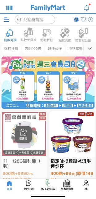 上禮拜的全家會員日沒搶到衛生紙~~殘念 剛開APP看到 明天9/27又可以換惹,希望一定要搶到啊啊啊啊 優惠時間:9/27星期三限定 全家週三會員日活動內容: 一樣有三項商品如下~ 6千點換衛生紙 800點換黑松茶花一番煎茶/加倍佳葡萄氣泡飲 https://i.imgur.com/d938uy4.jpg