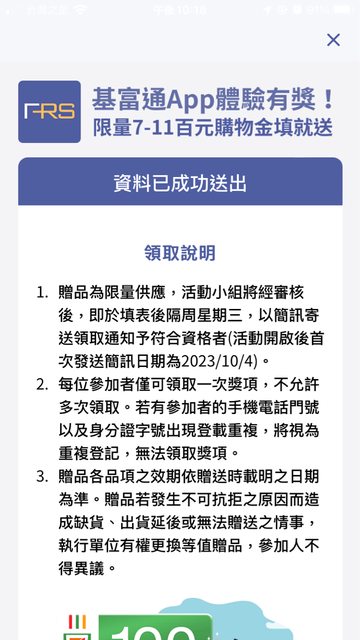 然後等下週三(10/4)會發簡訊送禮券 ————————————————————— 下午收到的 現在還可以登記 但上面沒辦法看到剩餘名額數量, 所以不確定還有沒有剩~ 以上分享~ 補一下官網說明 https://reurl.cc/9R1OLa 是取前25000名下載並登入的人 -- ※ 發信站: 批踢踢實業坊(www.ptt.org.tw), 來自: 114.36.99.217 (臺灣) ※ 文章網址: https://www.ptt.org.tw/Lifeismoney/M.1695739525.A.1EE ※ 編輯: seand8088503 (114.36.99.217 臺灣), 09/26/2023 22:48:54
