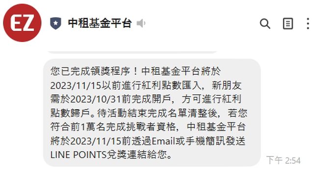 https://reurl.cc/7Mjynb 網址進去往下滑有個定番遊戲需先加中租基金的LINE官方帳號回答問題 答案: B、E、D 答完題填姓名、手機、信箱之後就可等候通知拿LP 5點 (1萬份限量) https://i.imgur.com/pPFbCYH.jpg
