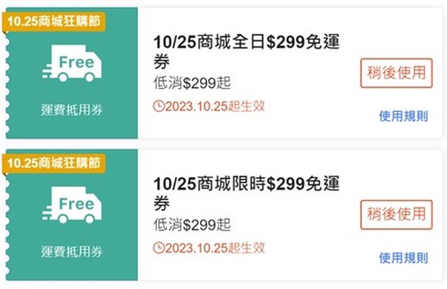 10/18的也可以先領了有2張 https://bit.ly/3ru2CwW 10/25也有兩張 https://i.imgur.com/TsFq3ZD.jpg