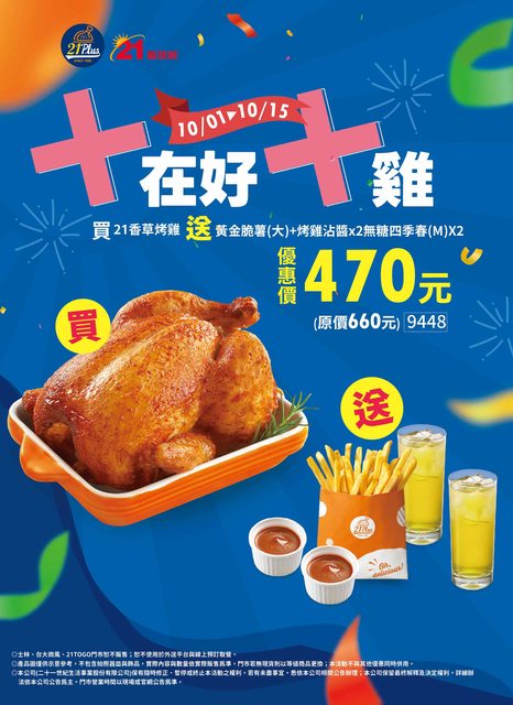 10/1~10/15 購買香草烤雞($470) 贈送雞汁辣醬、黃金脆薯、無糖四季春X2 台大微風、士林中正、21Togo、美食外送平台不參與活動 不能與其他優惠合用 https://i.imgur.com/UV7TtGy.jpg