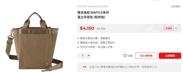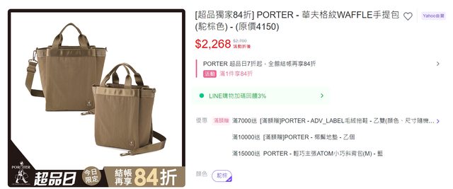 PORTER品牌日特價商品 折扣後價差很大 有興趣的可參考 >> PORTER - 華夫格紋WAFFLE手提包(駝棕色) - (原價4150) $2,268 https://reurl.cc/z66Wgy https://i.imgur.com/otsyHla.jpg