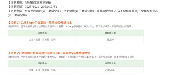 剛領錢時發現用國泰CUBE 手機提款,可以抽50元購物金 購物金會依照你領錢的通路不同,拿到的購物金也不一樣 網頁也有公告活動 請參考 https://www.cathaybk.com.tw/cathaybk/campaign/atm/2023event/ 提款抽購物金的通路蠻多的,全家、捷運站、萊爾富、全聯都有 https://i.imgur.com/qPjoPE6.jpg