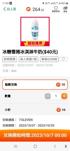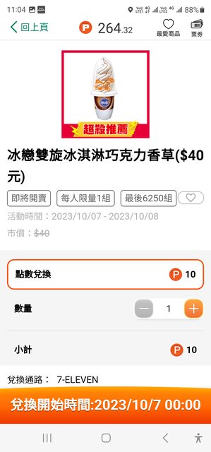 又來了~ OPEN POINT 10點兌換 冰戀雪捲冰淇淋牛奶 冰戀雙旋冰淇淋巧克力香草 各限量6250組 兌換開始時間:2023/10/7 00:00 ----- Sent from JPTT on my Samsung SM-S9180. -- ※ 發信站: 批踢踢實業坊(www.ptt.org.tw), 來自: 49.216.46.134 (臺灣) ※ 文章網址: https://www.ptt.org.tw/Lifeismoney/M.1696562026.A.D09