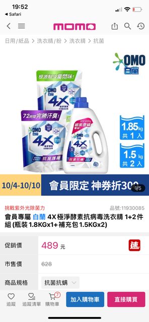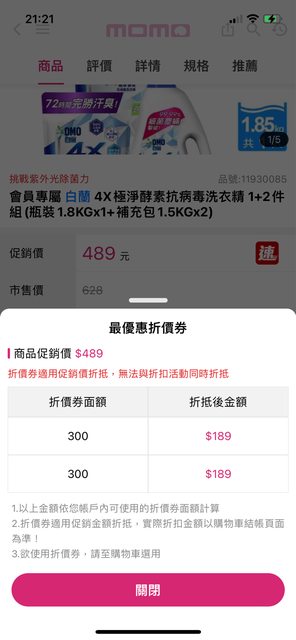 會員專屬 白蘭 4X極淨酵素抗病毒洗衣精 1+2件組(瓶裝1.8KGx1+補充包1.5KGx2) 促銷價489搭配折價券-300=189 比對蝦皮的價格 覺得蠻划算的 通常促銷價再搭折價券都是用原價去折 https://i.imgur.com/3azEkeQ.jpg