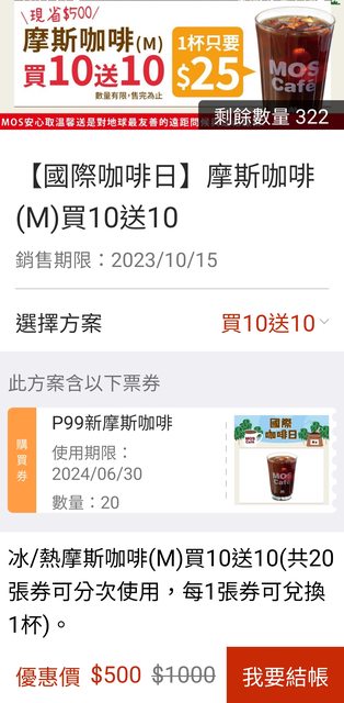 摩斯咖啡(M) 買10送10,原價1000,特價500。換算1杯25元。 使用期限:2024/6/30止 http://i.imgur.com/M6K4em2.jpg