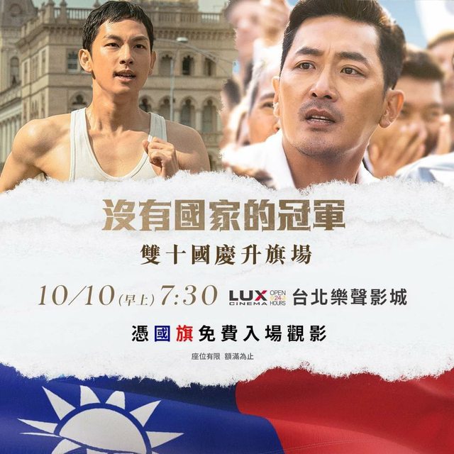 《#沒有國家的冠軍》一同慶國慶! 《沒有國家的冠軍》「雙十國慶升旗場」 【地點】 台北西門町樂聲影城 【時間】 10/10(二) 早上7點30分 攜帶中華民國國旗(包含中華民國帽子、中華民國衣服、中華民國青天白日滿地紅圖 樣...),即可免費參加「雙十國慶升旗場」入場觀賞《沒有國家的冠軍》 (座位有限,額滿為止) -- 《#沒有國家的冠軍》熱映中 當我掛上金牌,卻無法揮揚我的國旗… 我們想要的只是—— 穿上有著自己國家國旗的制服,在賽場上奔跑! 韓國觀眾滿意度高達96%! 繼《我只是個計程車司機》又一催淚真實故事改編 《犯罪都市》X《與神同行》團隊斥資190億打造催淚鉅獻! 《#與神同行》河正宇 X《#緊急迫降》任時完 將令觀眾淚腺失守! 《#非常律師禹英禑》朴恩斌 精彩共演熱血之作! #樂聲影城 #LUX #河正宇 #任時完 #朴恩斌 -- ※ 發信站: 批踢踢實業坊(www.ptt.org.tw), 來自: 101.137.116.53 (臺灣) ※ 文章網址: https://www.ptt.org.tw/Lifeismoney/M.1696846302.A.10F