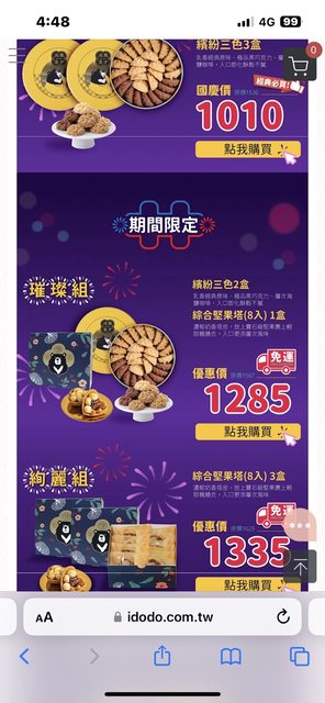 之前買過鴻鼎菓子的曲奇蠻喜歡的 現在10月有國民曲奇組合優惠價 璀璨組跟絢麗組買一組就有免運 https://i.imgur.com/a1pRinC.jpg