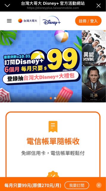 台哥大加掛Disney+ 6個月方案現在每月只要99元 單一門號限辦一次 有需要的快辦喔 https://bit.ly/46NdZ1Z -- ※ 發信站: 批踢踢實業坊(www.ptt.org.tw), 來自: 101.9.114.28 (臺灣) ※ 文章網址: https://www.ptt.org.tw/Lifeismoney/M.1697636731.A.E27