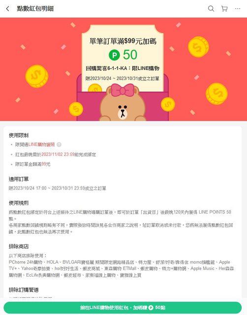 推 sines: 感謝,有從LINE購物進去,但沒有從紅包處前 49.158.66.93 10/24 22:33