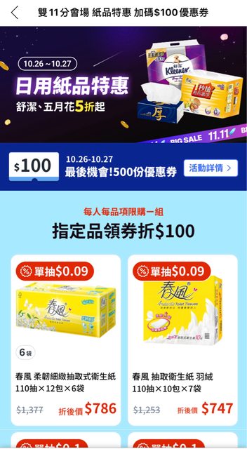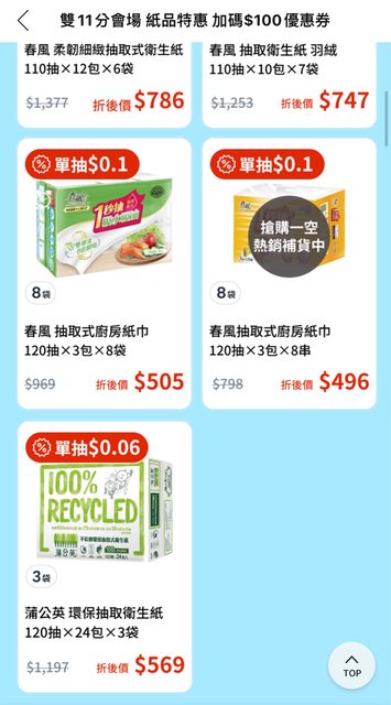 酷澎衛生紙今天有優惠,春風折$100 跟其他家比價過,真的有便宜! 還有廚房紙巾 https://i.imgur.com/KNFUGpI.jpg