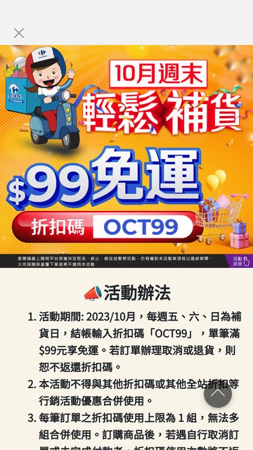 家樂福最近有點佛 原本這個優惠碼一週限定使用一次 但好像從上週開始改成了可以無限次數使用 上個週末我一共下了3單 剛下了一單後 優惠碼也還是可以繼續使用 懶得出門的人不妨參考看看 https://i.imgur.com/alMUbXd.png