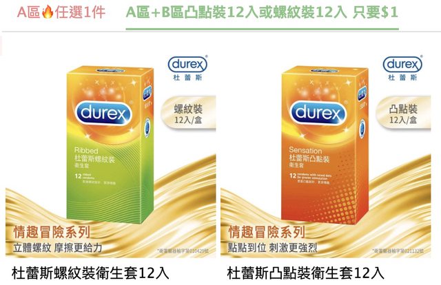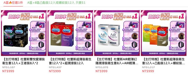 杜蕾斯官網現在買A區+1元多送12個套子 A區都999,最多可以買36個 https://i.imgur.com/elYDSam.jpg