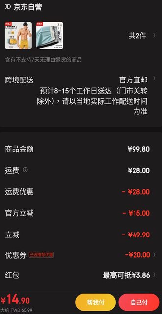 tzuyangchien: 謝謝京東王,買了兩組內褲66~ 220.129.72.204 10/27 21:53
