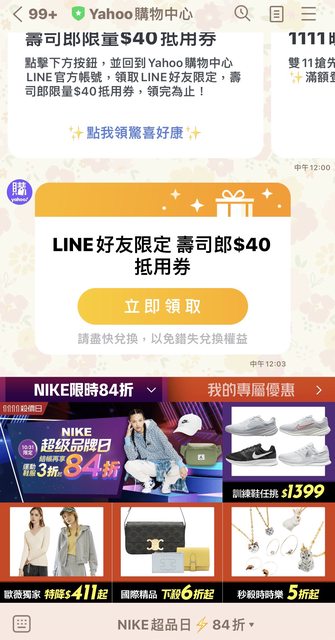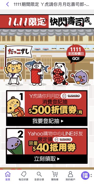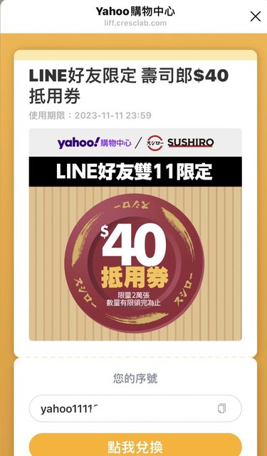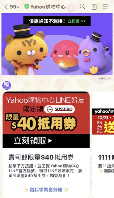 ▌領取期間:2023 年 10月 31 日 10:00 起開放領取,共2萬張,領完為止。 ▌活動內容:Yahoo購物中心LINE官方帳號好友,透過Yahoo購物中心LINE官方帳號推播,點選領取以獲得壽司郎40元抵用券。新加入之好友,將透過歡迎訊息領取抵用券。 於全台壽司郎門市消費滿300元,出示LINE電子優惠券並提供壽司郎門市人員核銷,即可享有優惠,每券限使用乙次。 --- 要加Yahoo購物中心綁定帳號後可以領壽司郎優惠券$40(滿300可用) https://pse.is/5csvzf 1. 先加好友>>https://pse.is/5cj34e 2. 會看到這個畫面,點進去 https://i.imgur.com/WA1lm0U.jpg